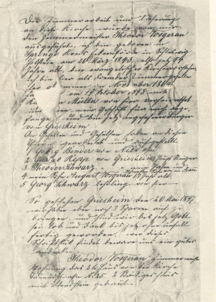 Die Zimmerarbeit und lieferung an dieser Kirche wurde von mir, dem Zimmermeister Theodor Vosgerau ausgeführt, ich bin geboren in Sprenge Kreis Eckernförde in Schleswig Holstein am 26 März 1843 alter jetz 54 Jahre alt bin evangelischer Kirchenworschaft? ich bin als Fremder Zimmergeselle [...] im November 1864 ha[...] am 19 Oktober, 1872 mit Ka[...] Müller von hier verheiratet und [...] mein Geschäft für mich ange fangen und bin jetz angesehener Bürger von Griesheim An Gesellen und Geschäften haben an diesen Turm gearbeitet und aufgestellt 1 Georg Bender von Niedasen 2 Gustav Repp von Griesheim Haupt Neiger? 3 Theodor Schwarz von Griesheim mein Paten? und Schwester Sohn 4 mein Sohn August Vosgerau 17 Jahr alt. 5 Georg Schwarz lehrling von hier. So geschehen Griesheim den 20 Mai 1897. Wir haben aber noch 3 Scharren auf zu bringen, und sind wir bis jetz Gott seilob und dank bis jetz ohne unfall fertig geworden, wer dieses Schriftstück findet bewar uns in guter andenken Theodor Vosgerau Zimmermeister Wohnung das 2 te Haus von der Kirche Taunusstraße Nr. 25. 2 Prüsiges haus mit Blendstein gebaut. Relevante Personen auf diesem Dokument: ![]() Upload: am: 11.03.2013 ![]()
