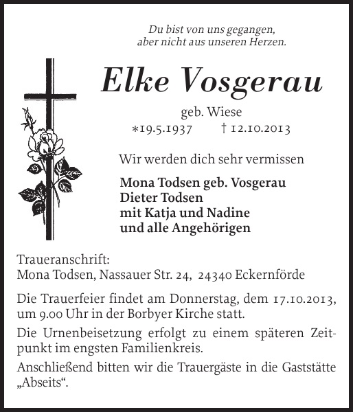 "Elke Vosgerau geb. Wiese" Kategorie: Trauer, 1095 mal angesehen